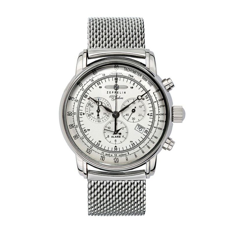 ドイツの歴史的飛行船ZEPPELINの100周年を記念したベストセラー『100周年記念シリーズ』。 飛行船の機体をデザインソースに、丸みを帯びたケース、ボンベダイヤルやドーム型のガラスで立体的に設計されています。 ダイヤルにはドイツ語で「100周年」を意味する「100Jahre」がデザインされています。 『100周年記念シリーズ クロノグラフアラーム』は、12時間クロノグラフ、12時間アラーム、速度を測るタキメーター、距離を測るテレメーターを搭載。充実の機能を搭載したベストセラーモデルです。