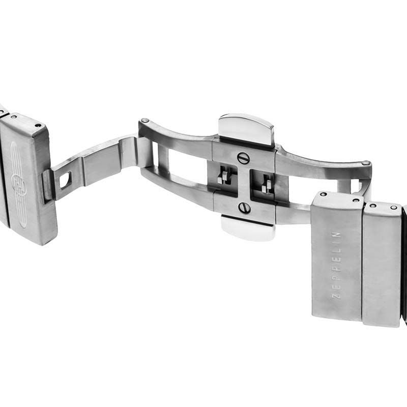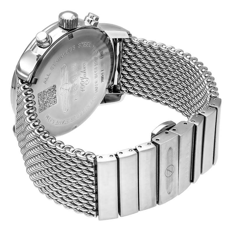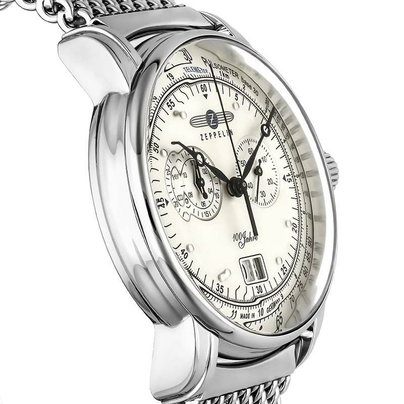 飛行船ZEPPELIN号の誕生100周年を記念して誕生したベストセラー『100周年記念シリーズ』。 飛行船をデザインソースにした丸みを帯びたダイヤルやドーム型のガラスが特徴です。 ミラネーゼブレスレットがレトロな雰囲気を醸成します。