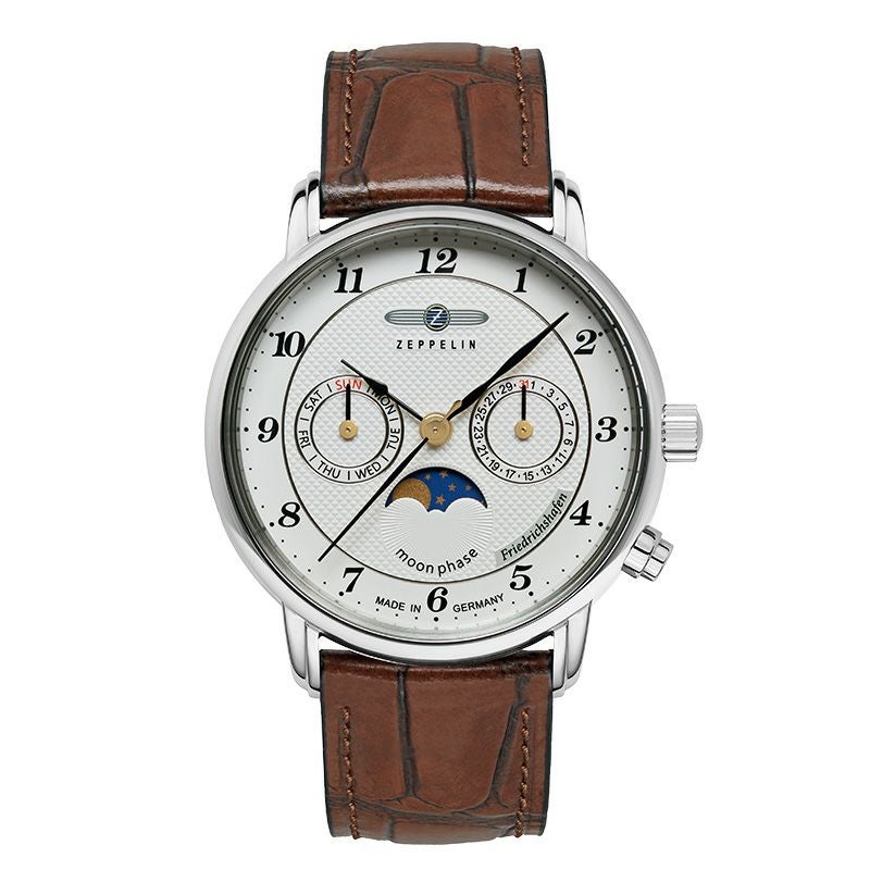 36mmのステンレススチールケースにシルバーのギョーシェダイヤルを採用した「8537-1」は、小ぶりでエレガントなモデル。 ムーンフェイズ、日付、曜日表示を搭載し、Ronda Cal. 706.1クォーツムーブメントで正確な時を刻みます。 ブラウンレザーストラップが上品な印象を与え、日常使いからビジネスシーンまで幅広く活躍します。