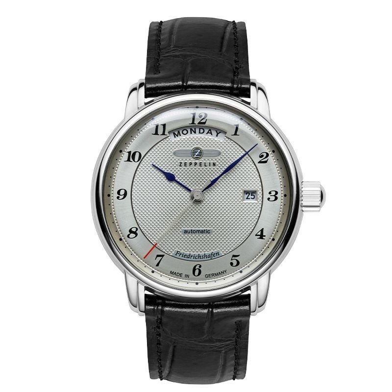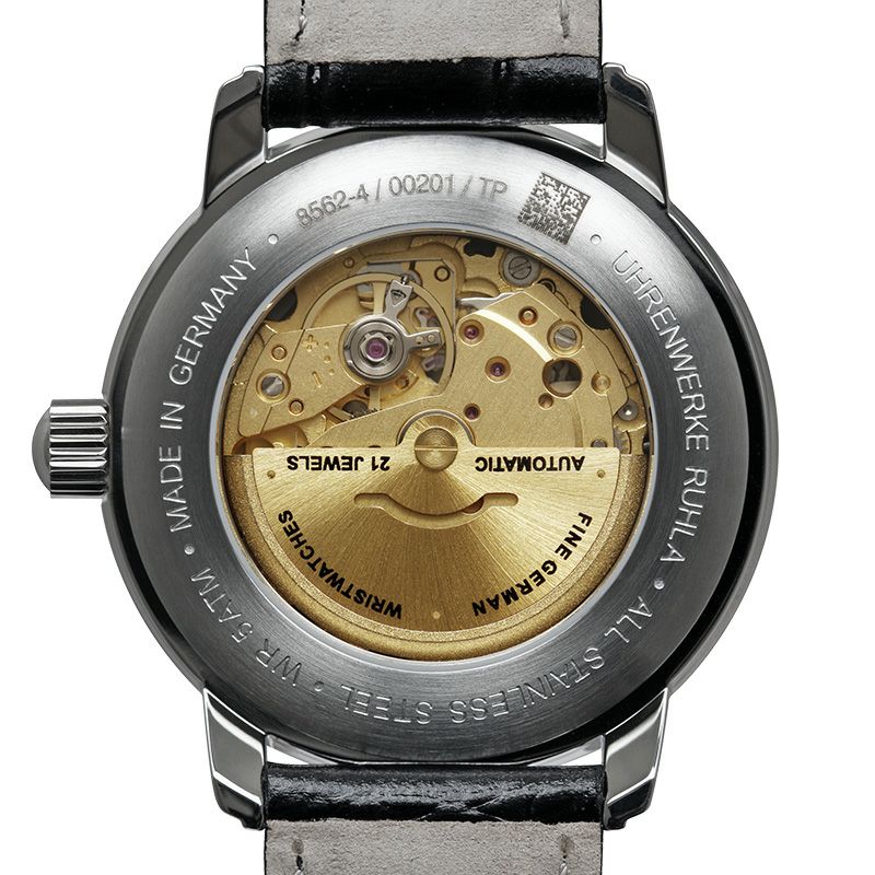 シルバーダイヤルにブラックレザーストラップを組み合わせた「8562-4」は、クラシックなデザインが魅力の自動巻きモデル。 40mmのステンレススチールケースに日付・曜日表示を備え、シースルーバックからはムーブメントの精緻な動きを堪能できます。 日常生活防水(5ATM)にも対応し、実用性も兼ね備えています。
