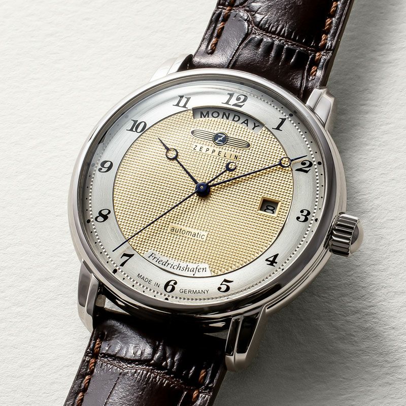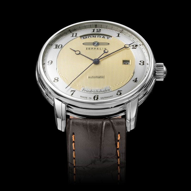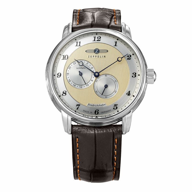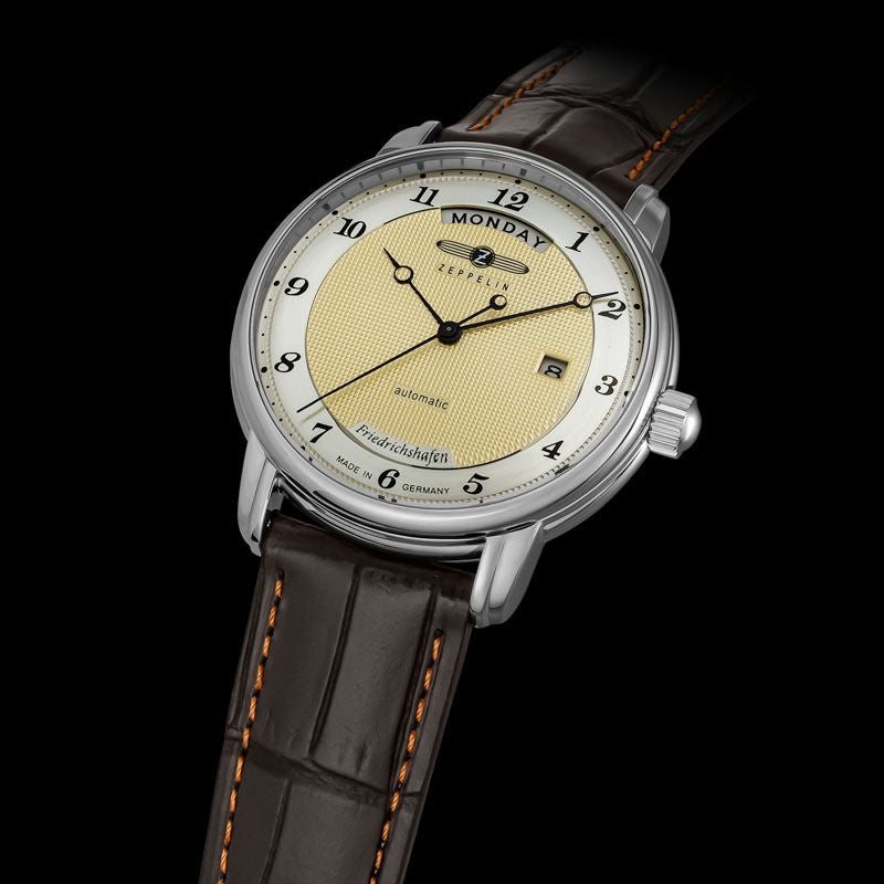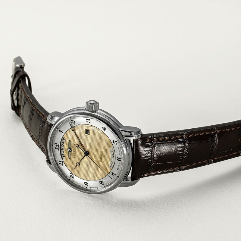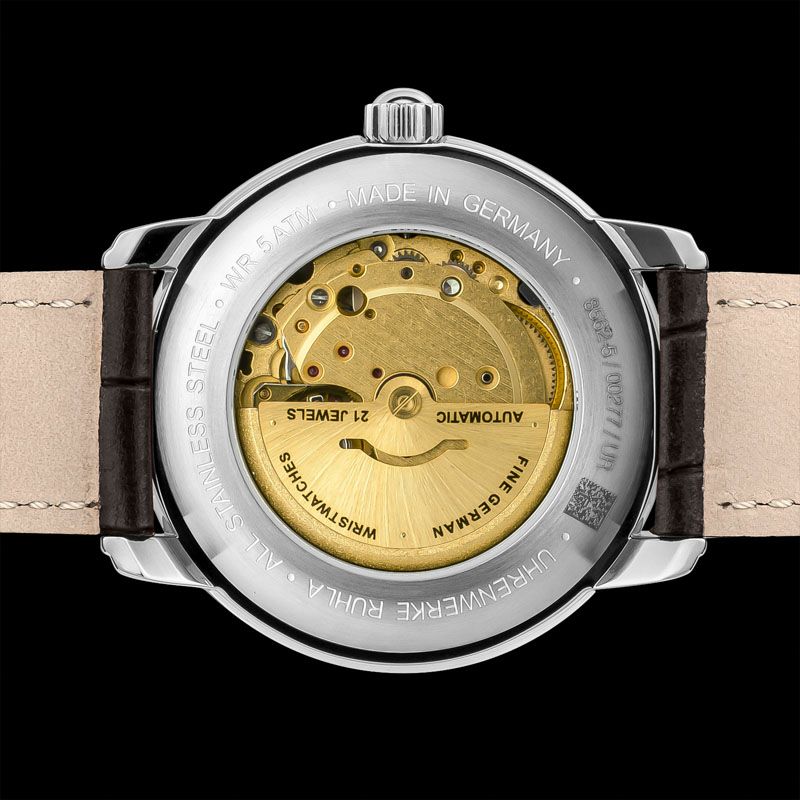 ゴールドトーンのダイヤルとブラウンレザーストラップが調和した「8562-5」は、エレガントな雰囲気を纏う自動巻きモデル。 40mmのステンレススチールケースに日付・曜日表示を備え、シースルーバックからはムーブメントの精緻な動きを楽しめます。 日常生活防水(5ATM)にも対応し、実用性と美しさを兼ね備えています。