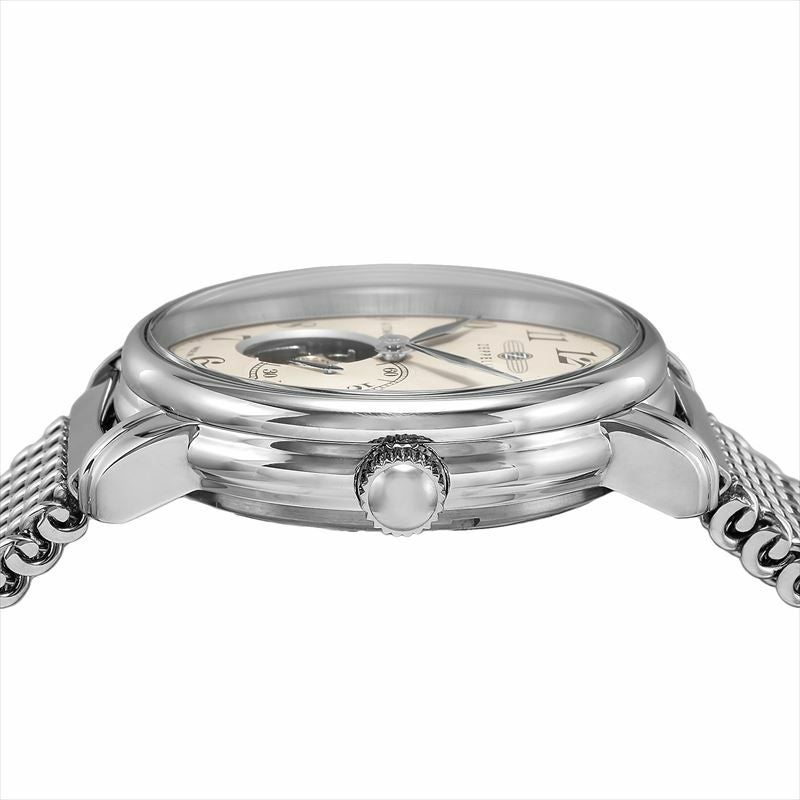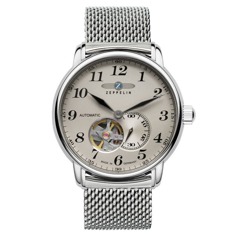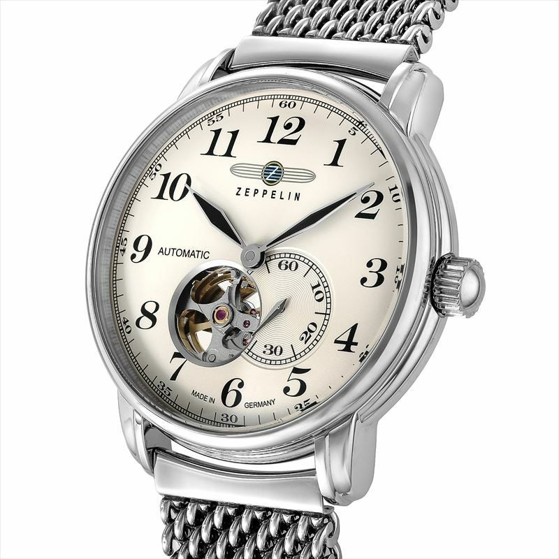 LZ127 GRAF ZEPPELIN号をモチーフに開発されたオープンハート・オートマティック。機械式ムーブメント82S5を搭載し、7時位置の穴からテンプの動きを堪能できます。ビザン数字のインデックスに、スペード針、ミラネーゼブレスレット等のヴィンテージデザインの意匠が、エレガントな腕元を演出します。