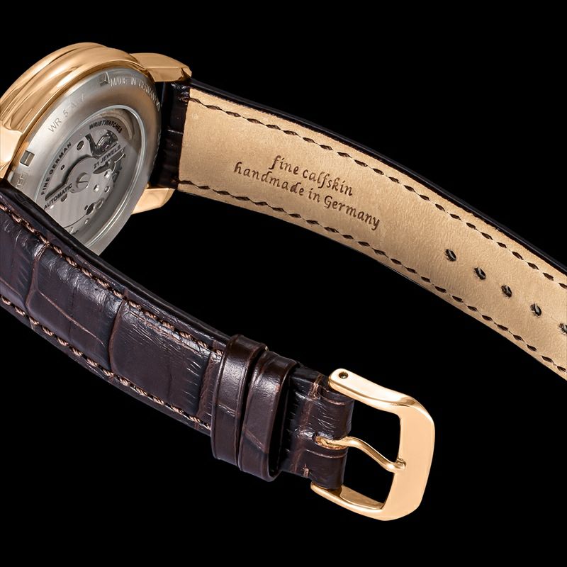 ストラップには、カーフレザーを採用。アイボリー文字盤やゴールドカラーケースと好相性のブラウンカラーで染め上げています。