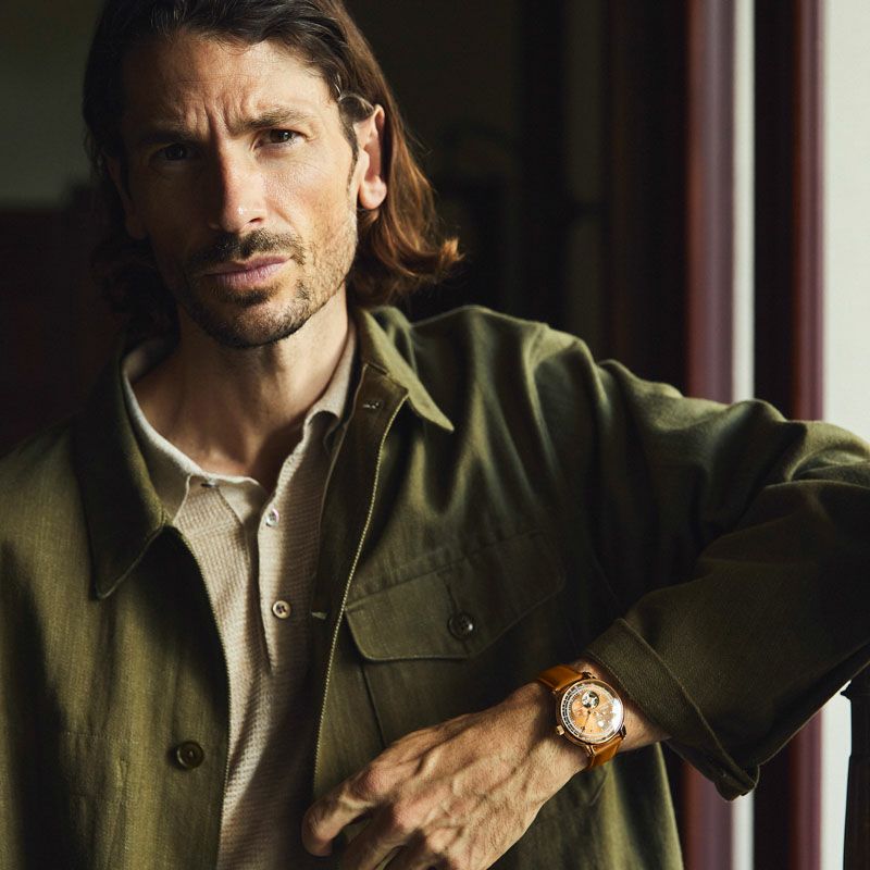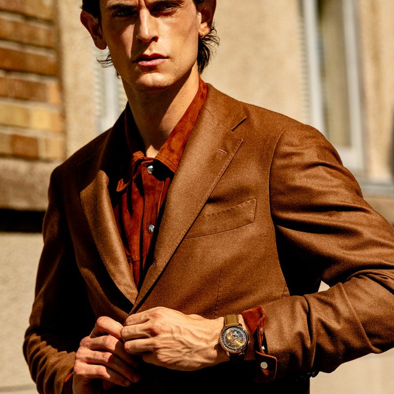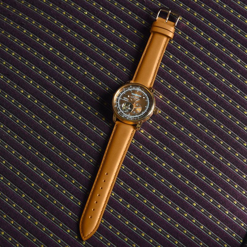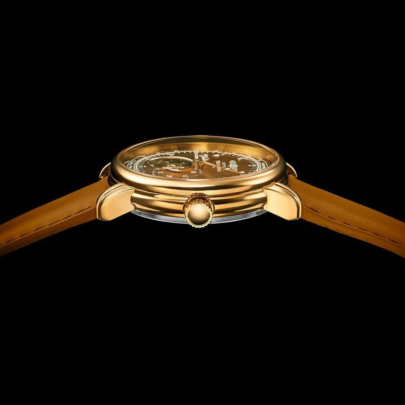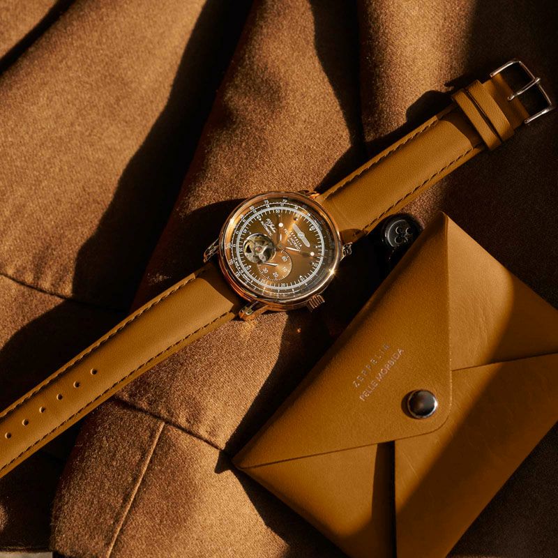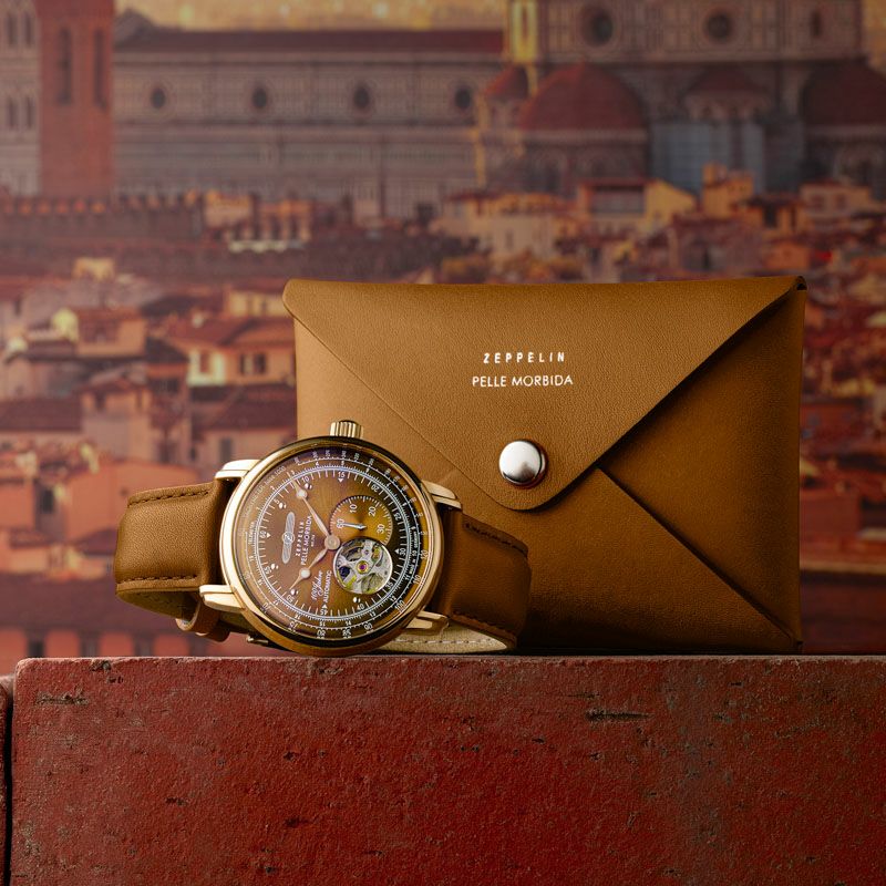 文字盤にはフィレンツェの赤煉瓦をイメージした特別カラーを採用し、ZEPPELINとして初のメタリックな仕上げをケースに施しています。飛行製をモチーフにした丸みを帯びたフォルムと色味、そして美しいタンレザーが融合することで、クラシックとモダンが見事に同居します。