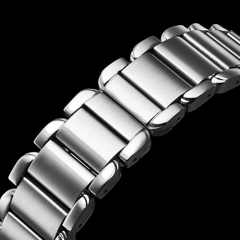 深く美しいネイビーのダイヤルと、マットとポリッシュの3連ブレスレットが織りなすエレガンス。
