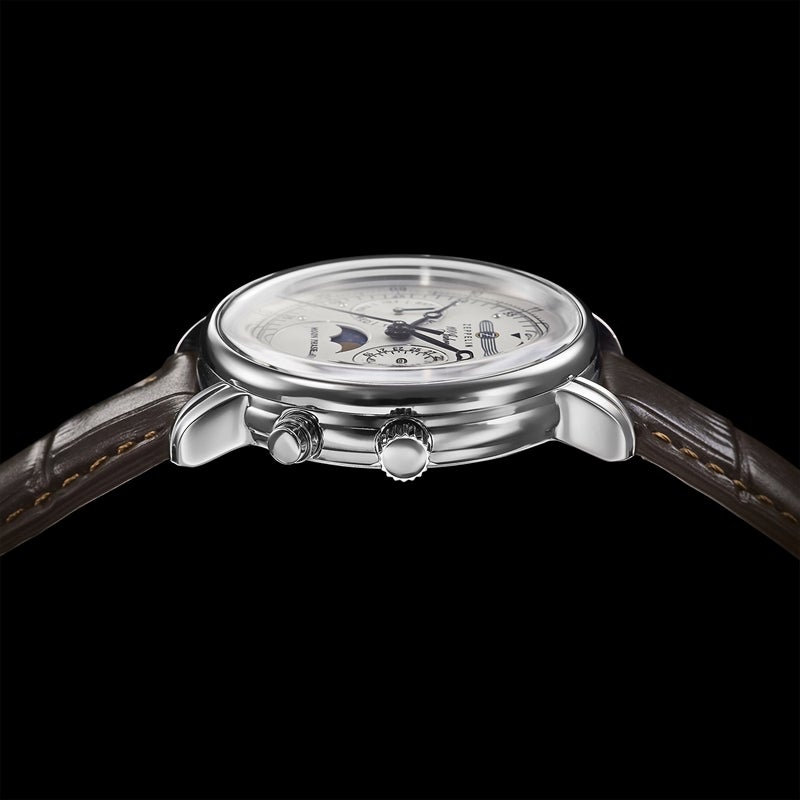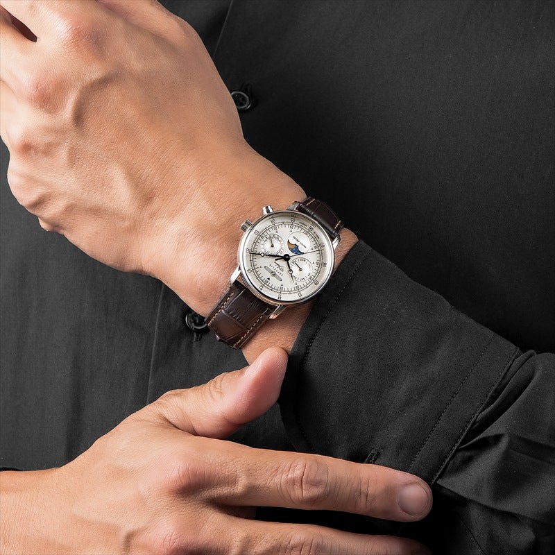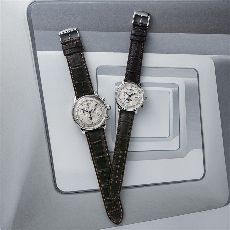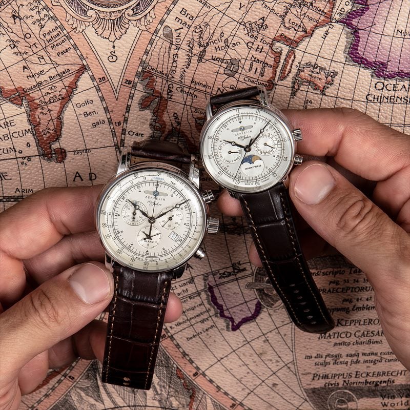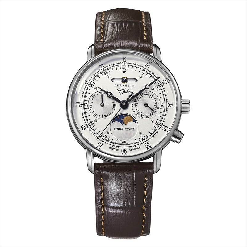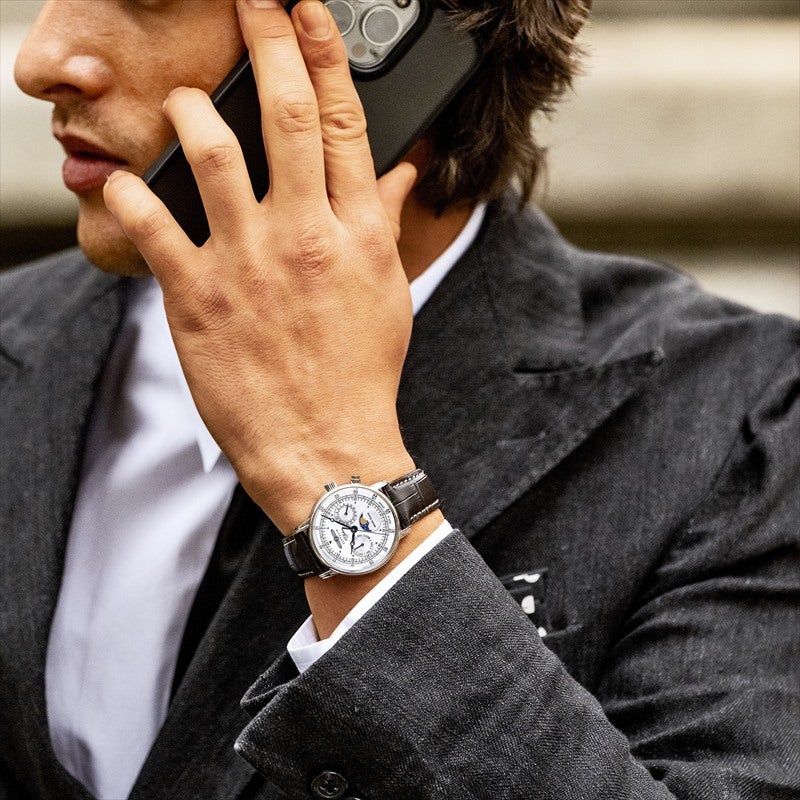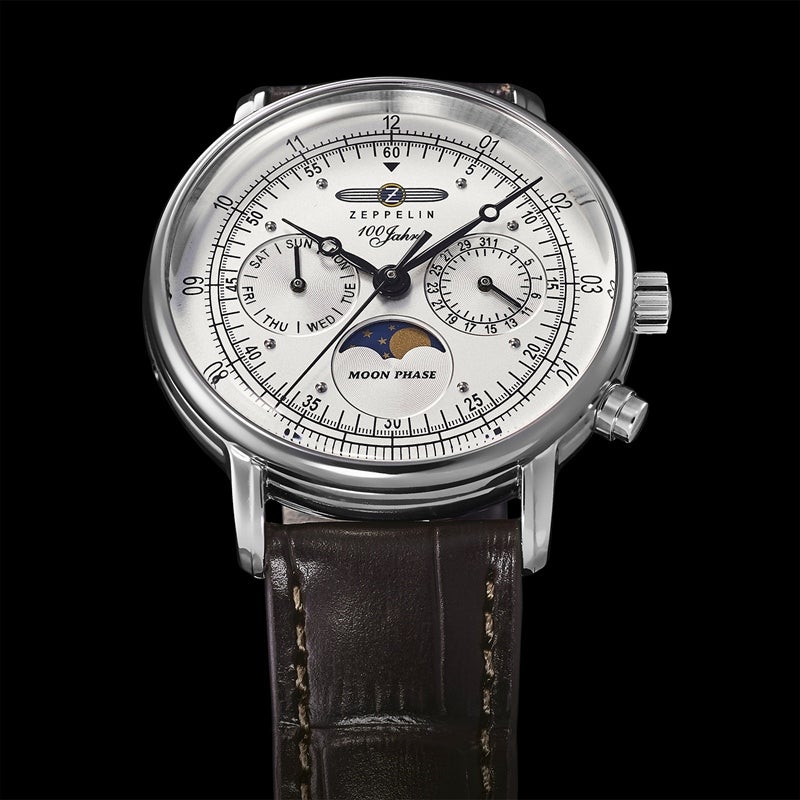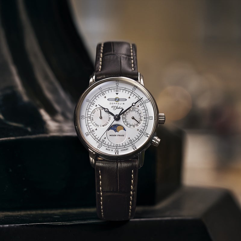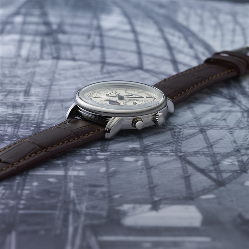 「100周年記念シリーズ」初、36mm径の小径モデル。1930年代の飛行船の旅を彷彿とさせるクラシカルな意匠を受け継ぎ、6時位置には優雅なムーンフェイズを搭載。豪華な空の旅に訪れる“月夜のひととき”をテーマにデザインされ、夜空を思わせるネイビーのディスク上で、ゴールドに彩色した月と星々が瞬きます。また、3時位置には日付表示、9時位置には曜日表示を備え、実用性にも配慮。各インダイヤルには同心円状の模様を刻み、文字盤に立体感を与えています。