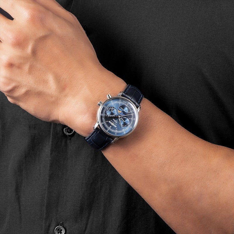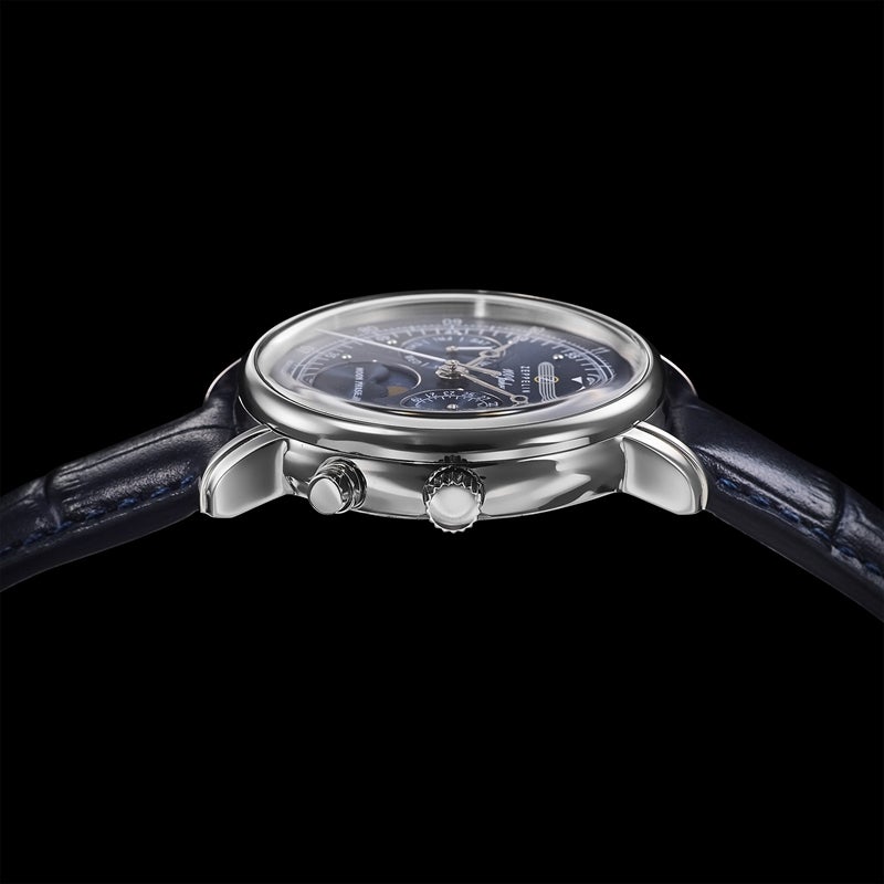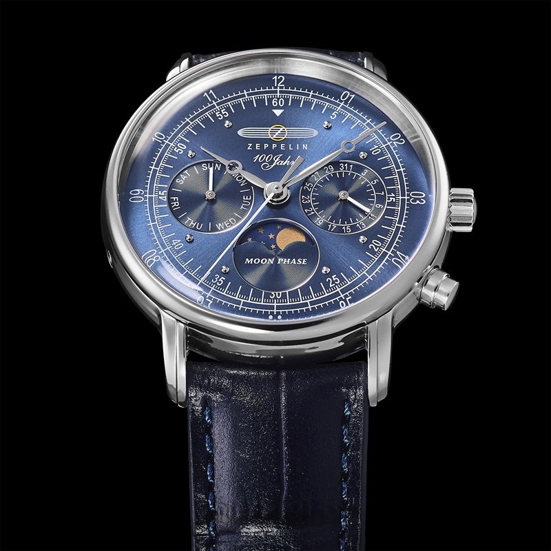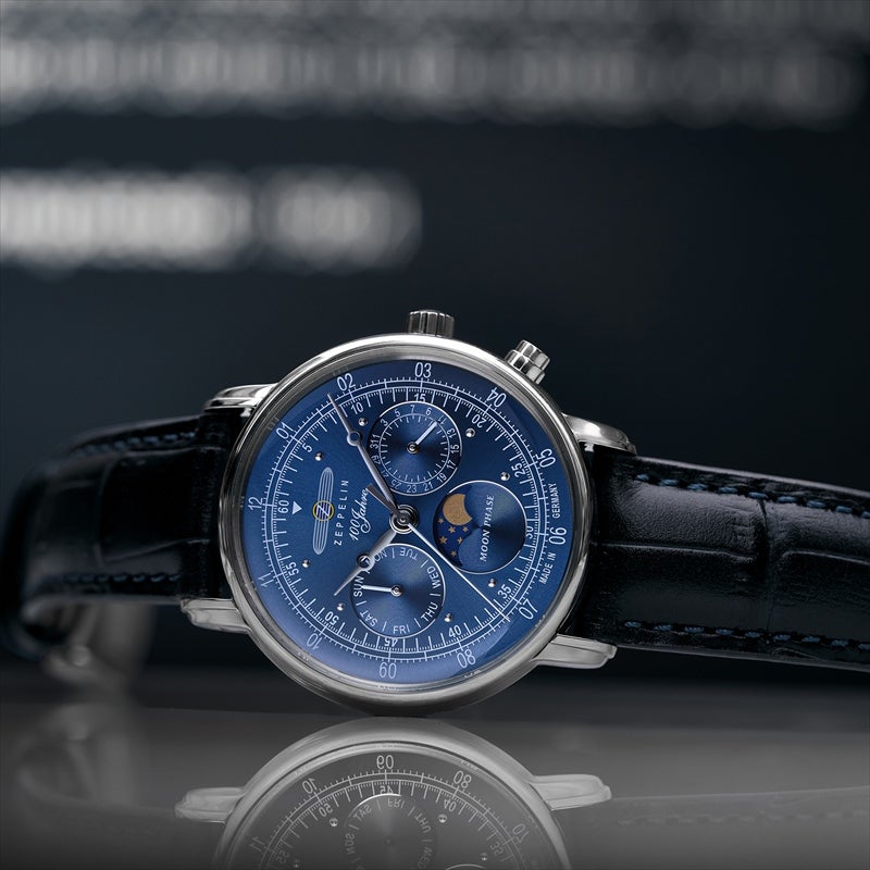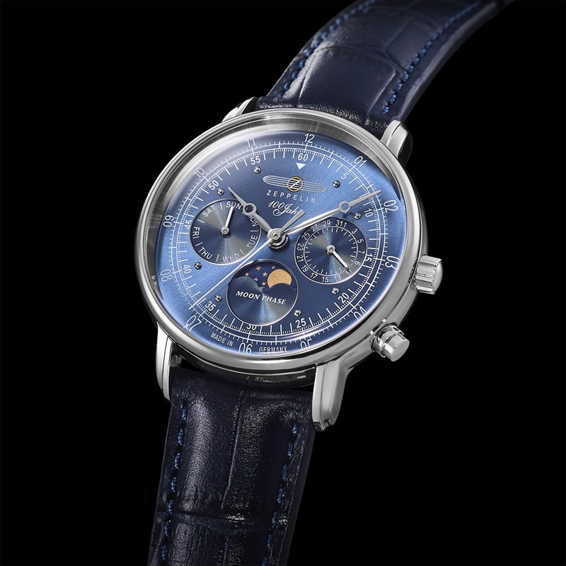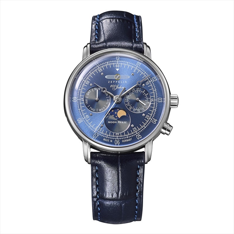「100周年記念シリーズ」初、36mm径の小径モデル。1930年代の飛行船の旅を彷彿とさせるクラシカルな意匠を受け継ぎ、6時位置には優雅なムーンフェイズを搭載。豪華な空の旅に訪れる“月夜のひととき”をテーマにデザインされ、夜空を思わせるネイビーのディスク上で、ゴールドに彩色した月と星々が瞬きます。また、3時位置には日付表示、9時位置には曜日表示を備え、実用性にも配慮。各インダイヤルには同心円状の模様を刻み、文字盤に立体感を与えています。