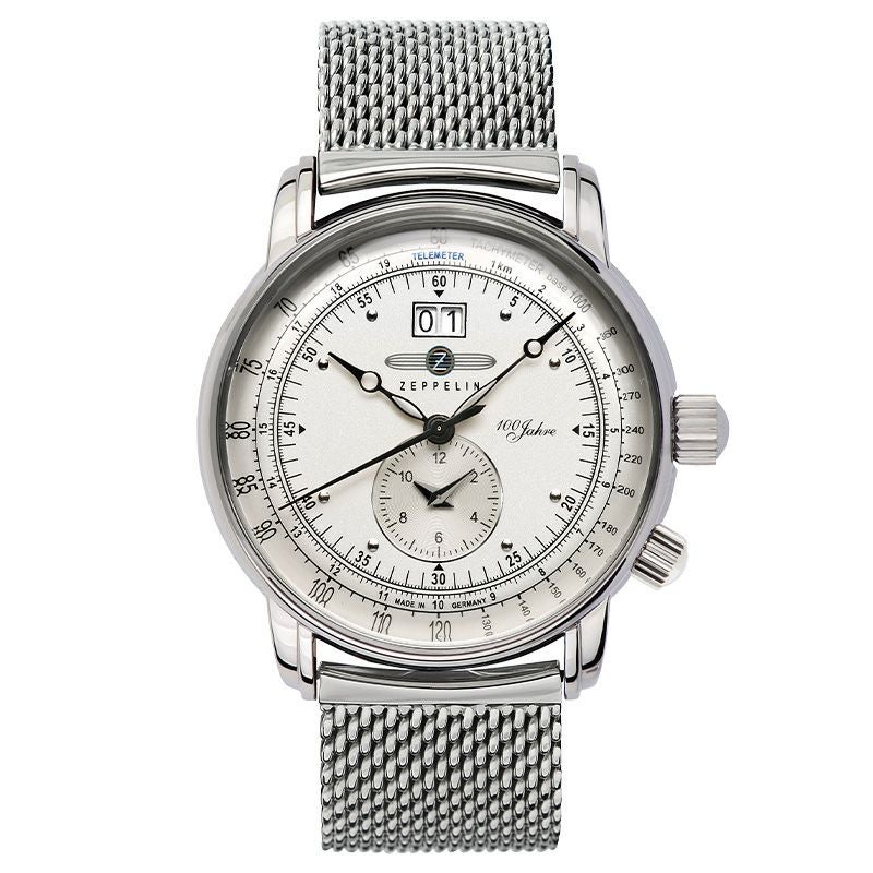 ZEPPELINの誕生100周年を記念して誕生したベストセラー『100周年記念シリーズ』。 「LZ1」の機体をデザインソースにした丸みを帯びたダイヤルやドーム型のガラスが特徴です。 ダイヤルにはドイツ語で「100周年」を意味する「100Jahre」の文字が入っています。 『100周年記念シリーズ デュアルタイムビッグデイト』は6時位置のサブダイヤルで第二時刻を表示。グローバルなシチュエーションに適した逸品です。
