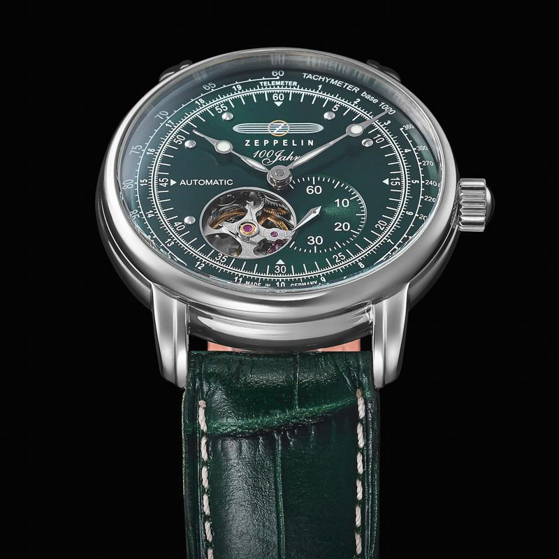 [7662-6]が見せるグリーンカラー文字盤は、飛行船の下で翡翠色に染まるボーデン湖畔からインスピレーションを得ています。1900年、ツェッペリン伯爵はついに初号機LZ-1の開発を成功させ、巨大な飛行船は大空へと舞い上がり、南ドイツの美しいボーデン湖畔のフリードリヒスハーフェン上空を飛行しました。その際、眼下に広がるボーデン湖畔が美しい翡翠色に染まり、乗務員たちの心を動かしたという逸話から、今作は誕生しました。