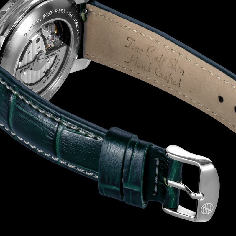 モデルを象徴するのが、7時位置に設けられたオープンハートです。その小窓からは鼓動のような動きを見せる“テンプ”を堪能でき、機械式ムーブメントならではの楽しみを味わえます。人工ルビーが使われた軸受やアンクル、金色に輝くテンワの色彩も、独特の個性をもたらすアクセントとなっています。