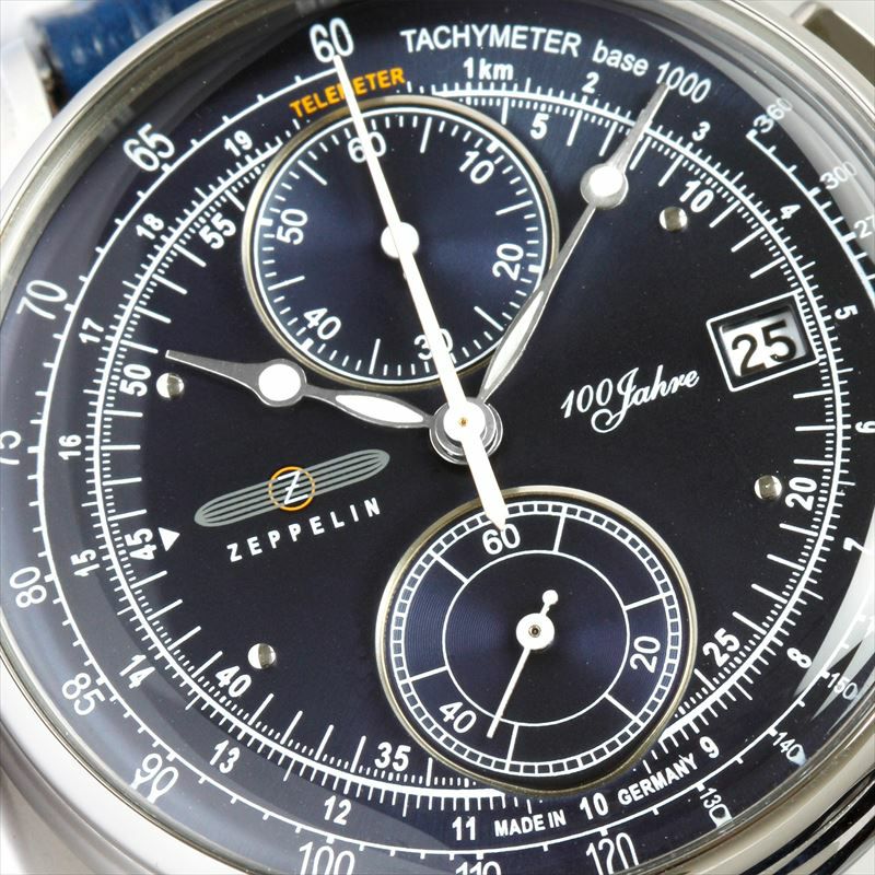 ZEPPELINの誕生100周年を記念して誕生したベストセラー『100周年記念シリーズ』。 飛行船の機体をデザインソースにした丸みを帯びたダイヤルやドーム型のガラスが特徴です。 ダイヤルにはドイツ語で「100周年」を意味する「100Jahre」の文字が入っています。 高機能で上品なデザインの『8670-3』は、60分計クロノグラフ搭載し、縦目のサブダイヤルとシックな色合いが、気品漂う魅力的な腕元を演出します。 *こちらはベルトが長めの商品になります(腕周り最小16.5cm 最大20.5cm)。ご購入前にご確認のほどお願いいたします。