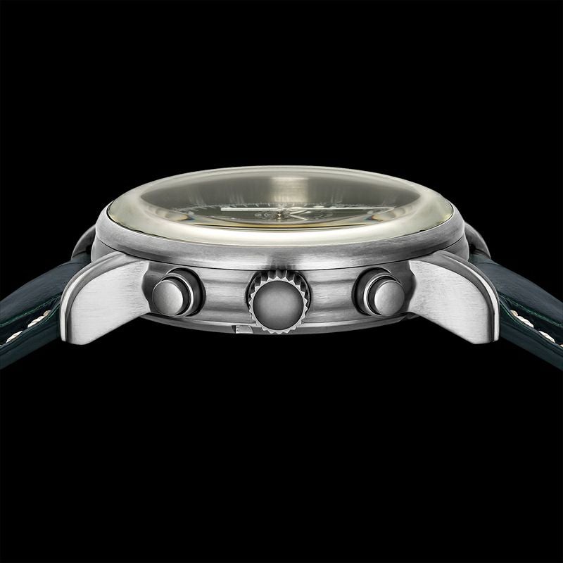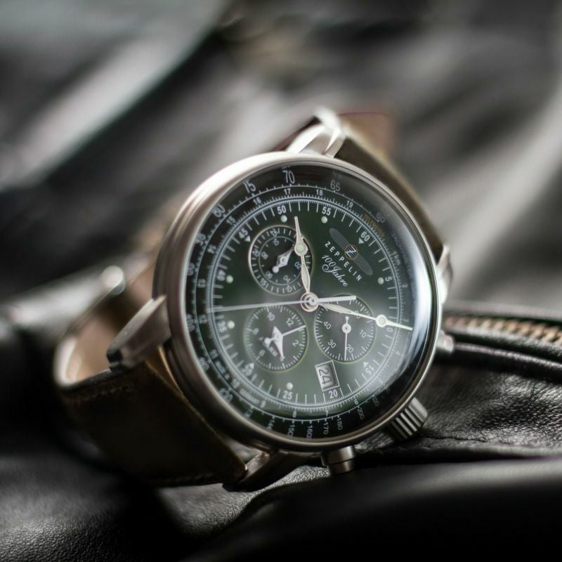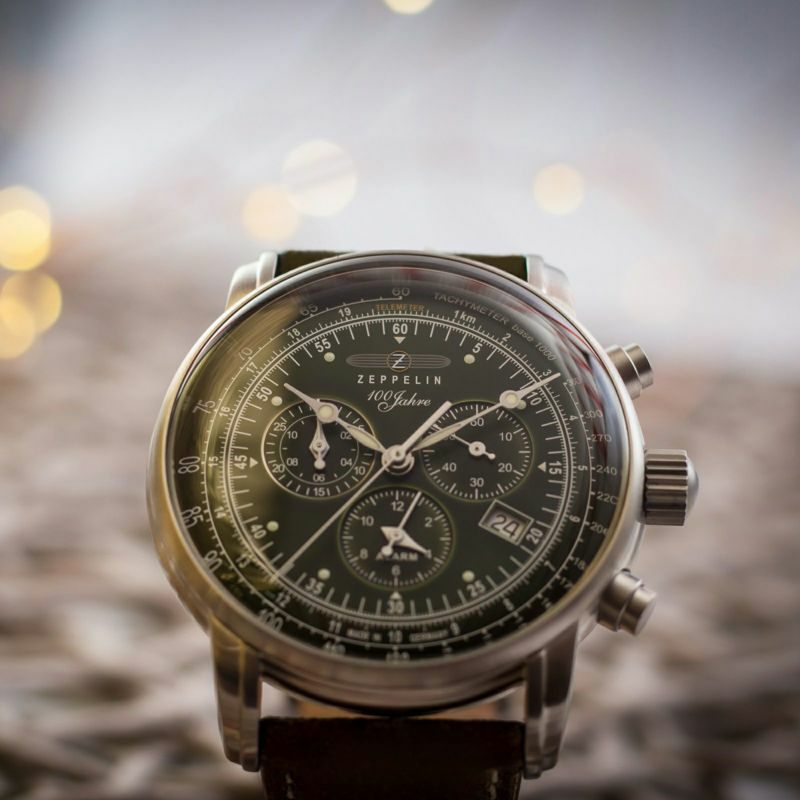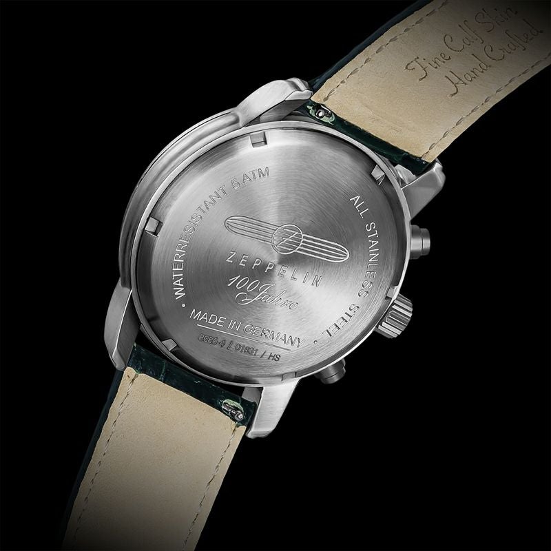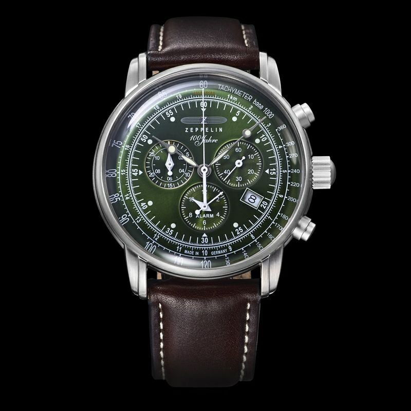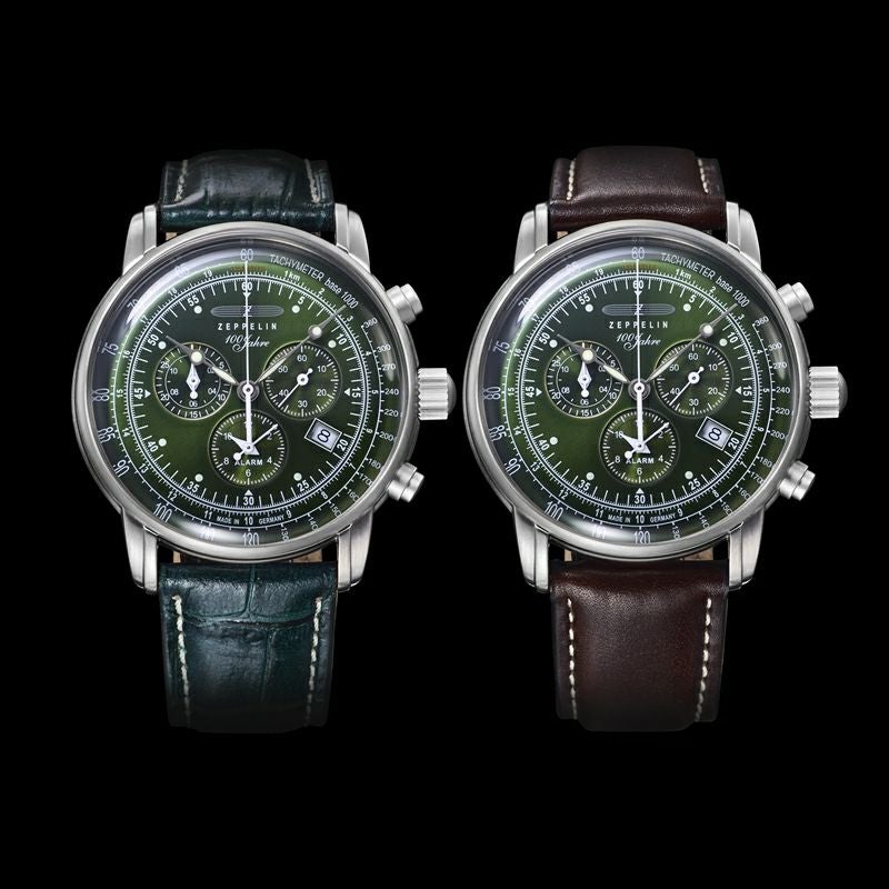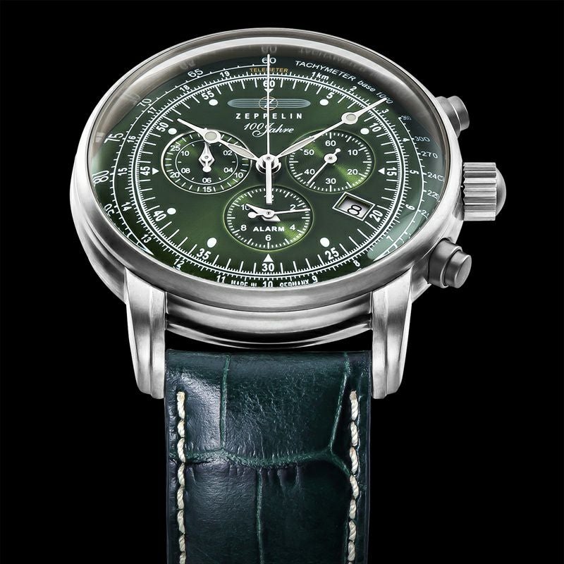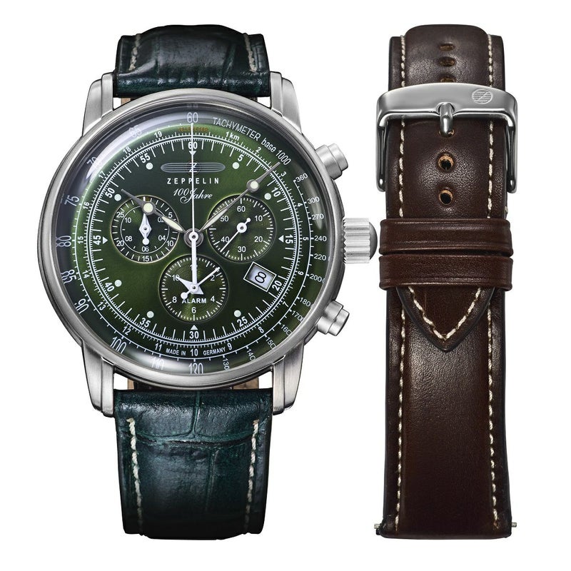 ドイツの歴史的飛行船ZEPPELINの100周年を記念したベストセラー『100周年記念シリーズ』。 飛行船の機体をデザインソースに、丸みを帯びたケース、ボンベダイヤルやドーム型のガラスで立体的に設計されています。 ダイヤルにはドイツ語で「100周年」を意味する「100Jahre」がデザインされています。 『100周年記念シリーズ クロノグラフアラーム』は、12時間クロノグラフ、12時間アラーム、速度を測るタキメーター、距離を測るテレメーターを搭載。充実の機能を搭載したベストセラーモデルです。 本製品は、グリーンのクロコ型押しレザーベルトに加え、ブラウンのスムースレザーベルトを付属したスペシャルセット。日々の気分やスタイリングに合わせてコディネートいただけます。
