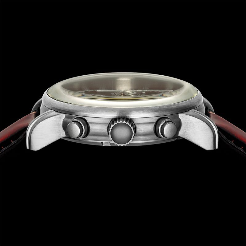 飛行船の機体をデザインソースに、丸みを帯びたケース、ボンベダイヤルやドーム型のガラスで立体的に設計されています。