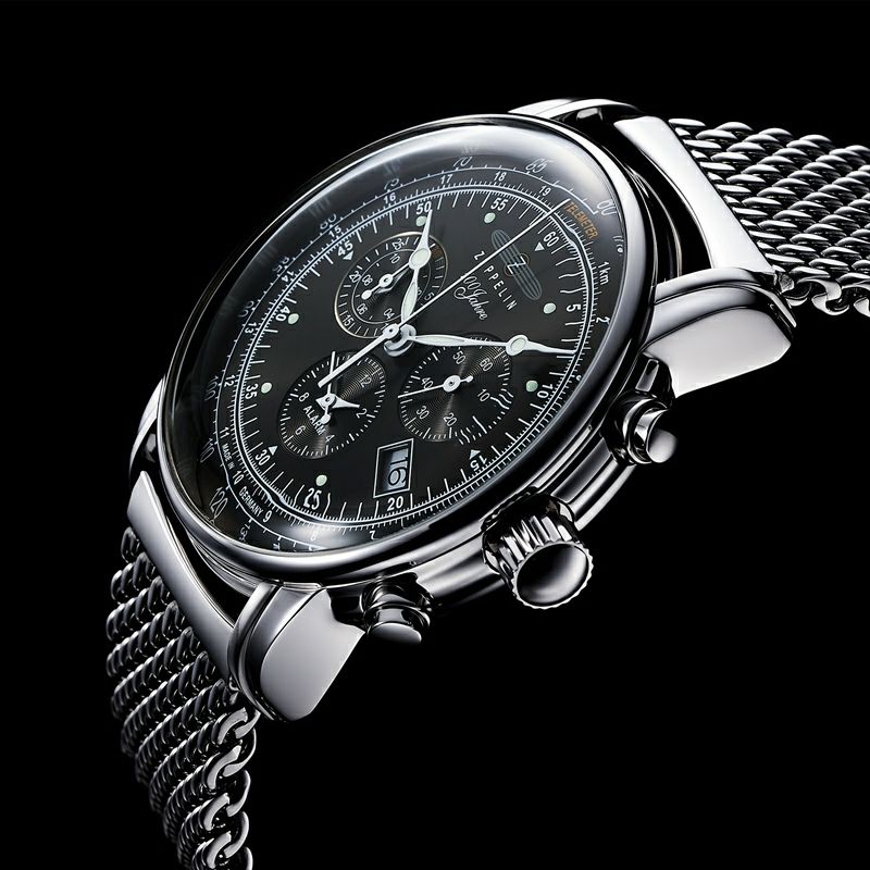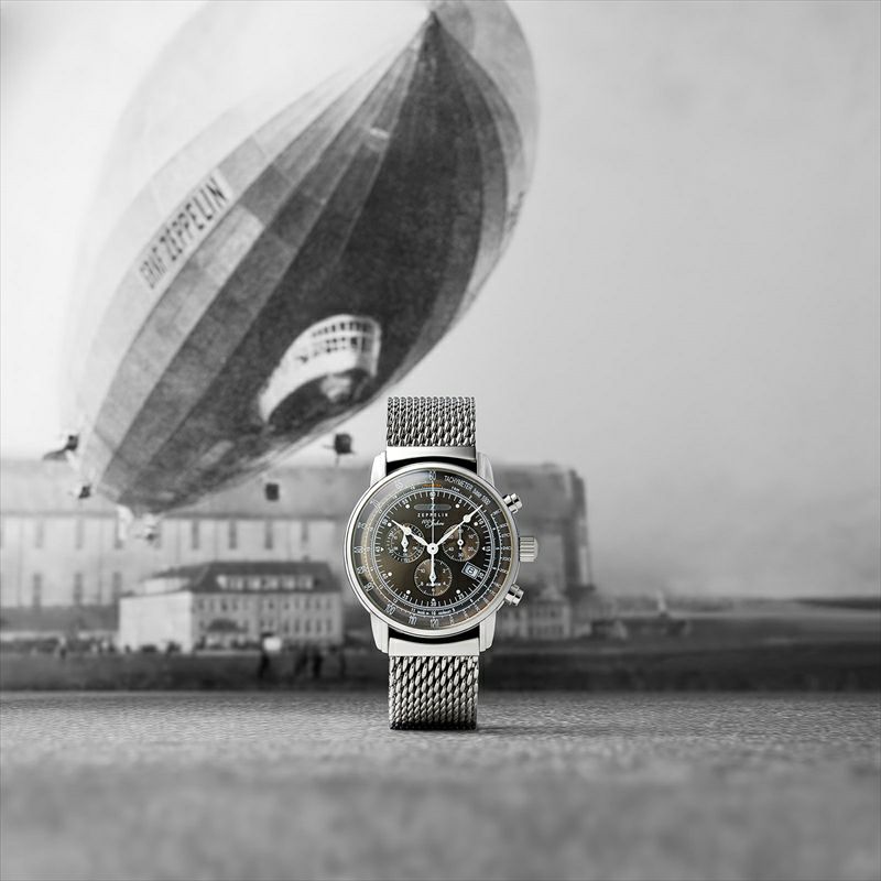 ドイツの歴史的飛行船ZEPPELINの100周年を記念したベストセラー『100周年記念シリーズ』。 飛行船の機体をデザインソースに、丸みを帯びたケース、ボンベダイヤルやドーム型のガラスで立体的に設計されています。 ダイヤルにはドイツ語で「100周年」を意味する「100Jahre」がデザインされています。 『100周年記念シリーズ クロノグラフアラーム』は、12時間クロノグラフ、12時間アラーム、速度を測るタキメーター、距離を測るテレメーターを搭載。充実の機能を搭載したベストセラーモデルです。 深みのあるメタリックグレー文字盤は、視認性に優れ、高級感を醸成します。 重厚感のある4㎜厚のミラネーゼブレスレットは、日本限定仕様として日本の方の手首に合わせた長さにリサイズしています。