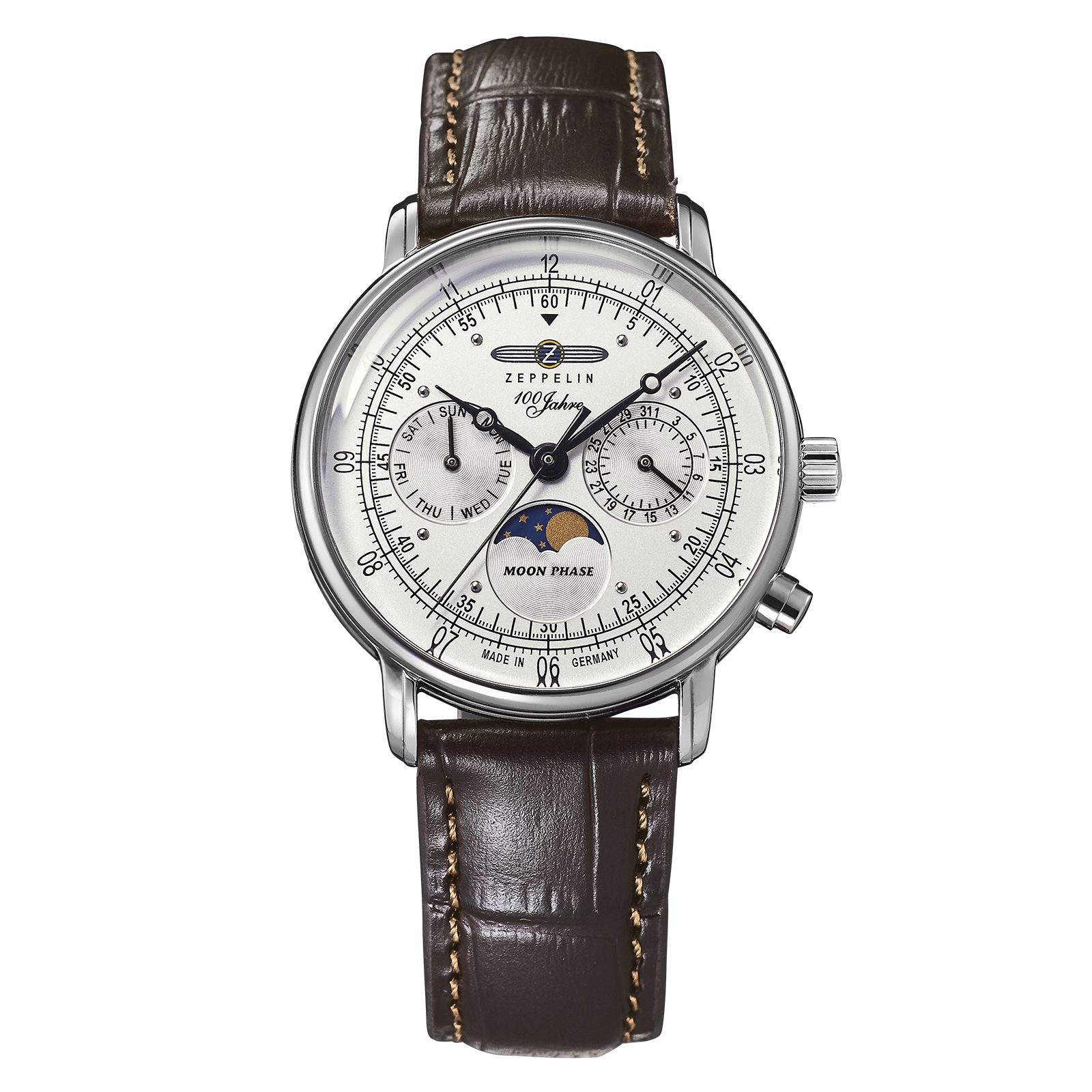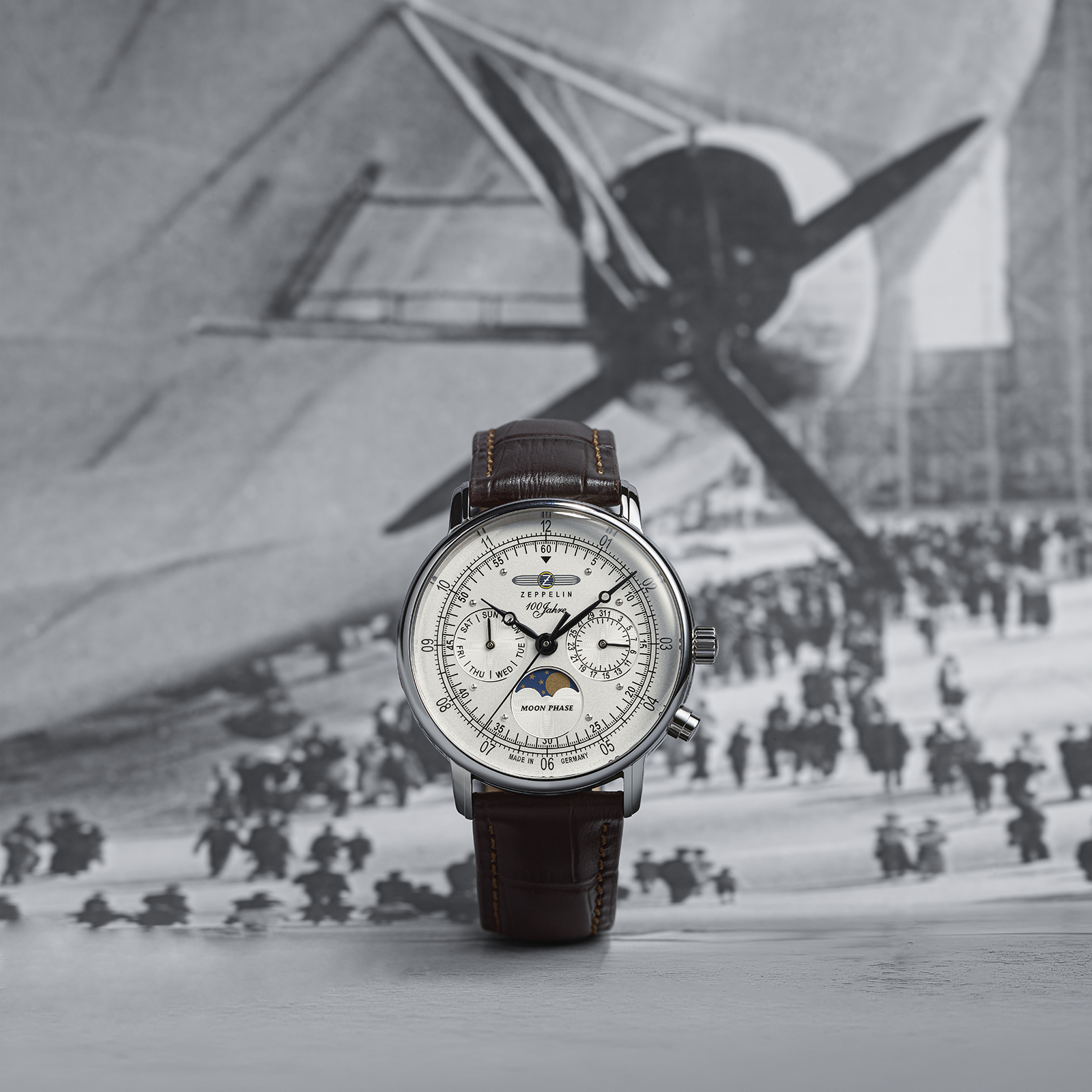 航空史をモチーフに、本質を追求した時計づくりを続けてきたツェッペリン。その理念を最も色濃く反映する「100周年記念シリーズ」から、クラシカルな意匠はそのままに、36mmへとダウンサイジングした初の小径モデル『100 YEARS ZEPPELIN 36㎜ MOON PHASE(100周年記念シリーズ 36mm ムーンフェイズ)』が登場します。
